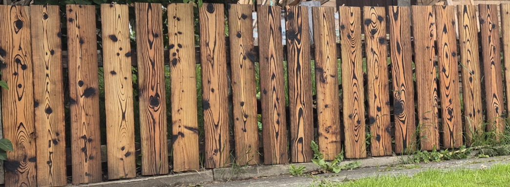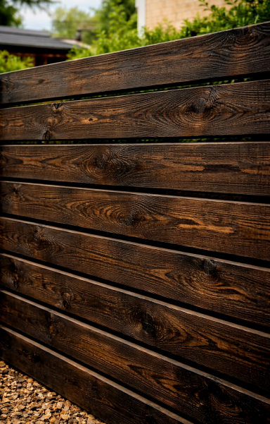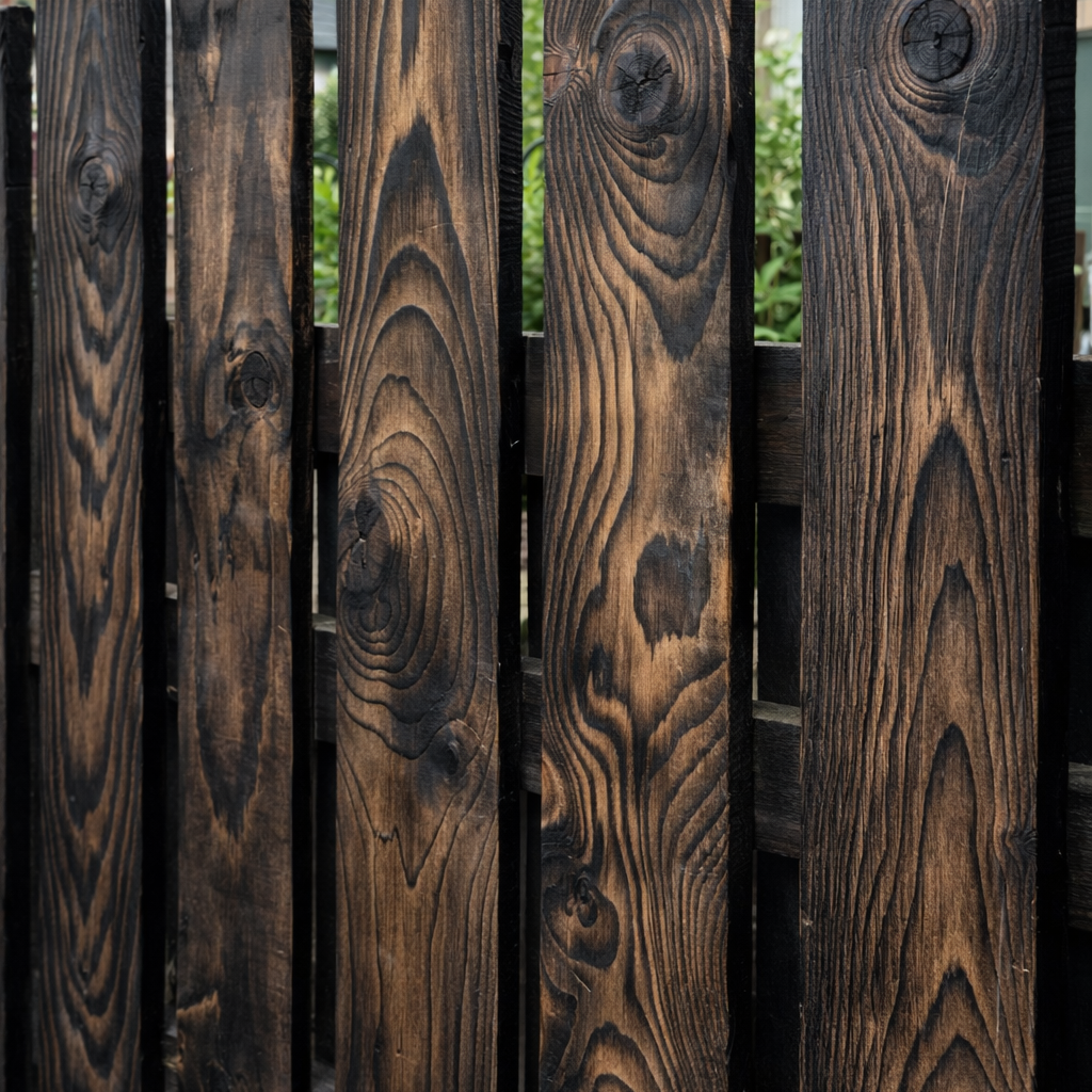 "Rich reddish-brown timber with a classic, elegant charred texture."