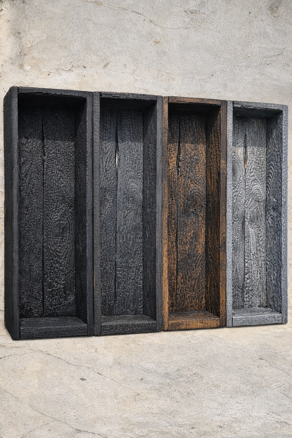 We offer a range of handcrafted charred wood finishes from warm natural browns to deep matte blacks. Each piece is individually burned, brushed and sealed to enhance the grain, increase durability, and create a unique, weather-resistant finish built to last. All our timber will come in M2.